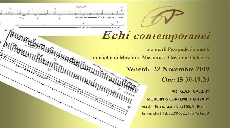 Venerdì 22 novembre dalle 15.30 alle 19.30, presso la Galleria ART G.A.P., in Via San Francesco a Ripa 105/a, Roma, ECHI CONTEMPORANEI, performance musicale a cura di Pasquale Sabatelli, musiche di Massimo Massimi e Cristina Colaneri.
