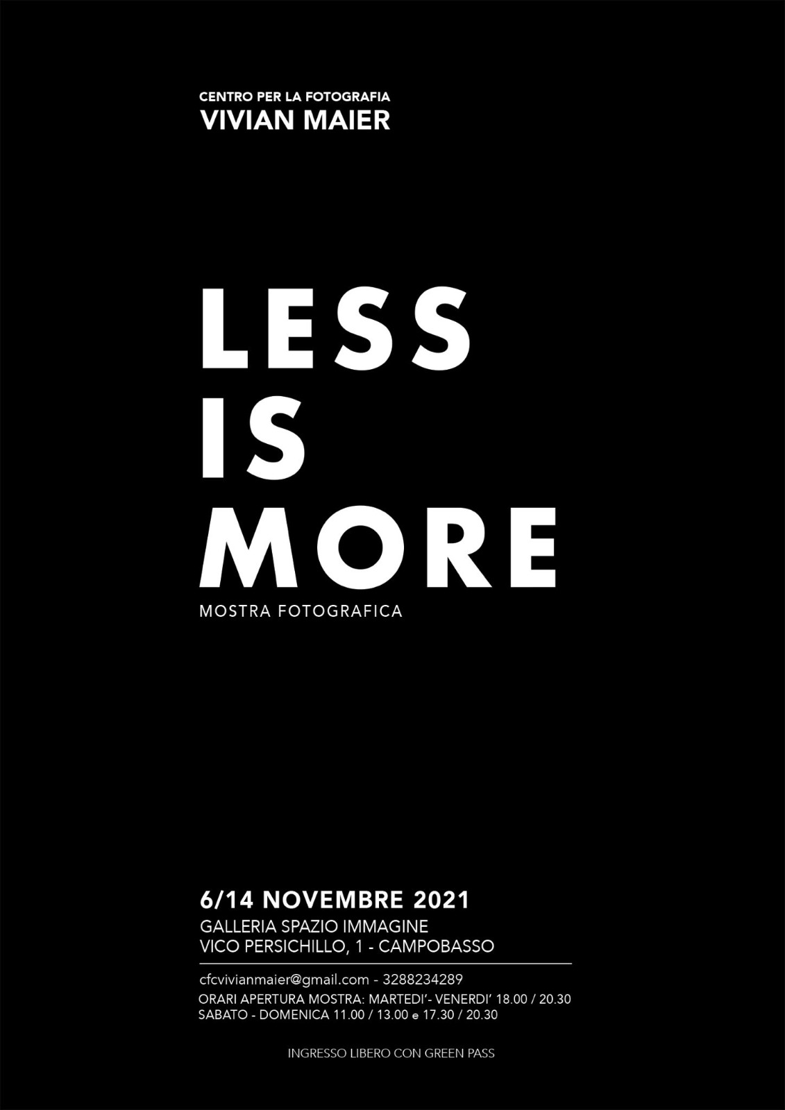Si chiama “Less in more” la mostra fotografica promossa dal Centro per la Fotografia Vivian Maier, che sarà inaugurata sabato 6 novembre alle ore 18 negli spazi della Galleria Spazio Immagine a Campobasso.